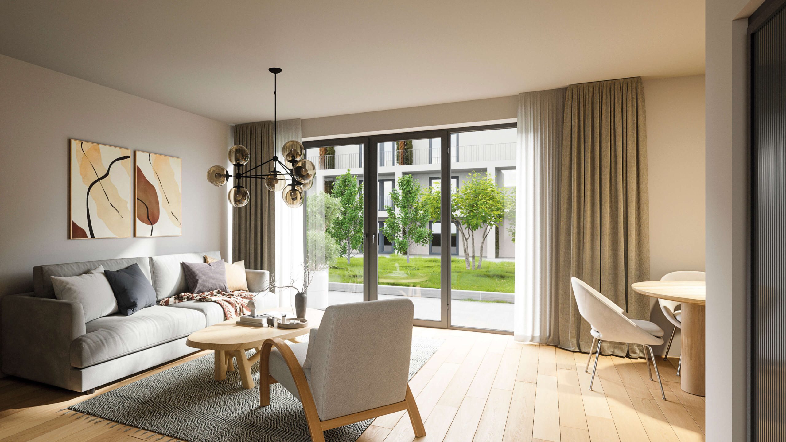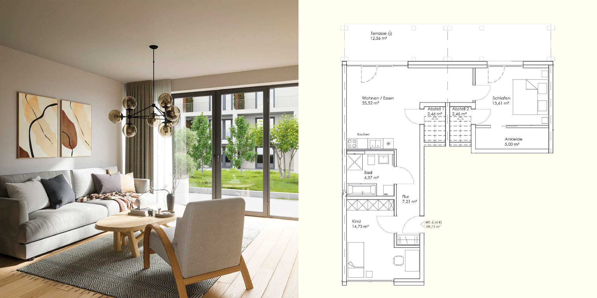 Viel Entfaltungsraum bieten die Gartenwohnungen im Erdgeschoss. Das besondere Plus an Lebensqualität ergibt sich hier aus der eigenen, kleinen Grünzone mit Platz für eine Terrasse. Die Gartenwohnung verfügt auf circa 89 m² über 4 Zimmer. Der große Wohn- und Essbereich mit offener Küche ist das Herzstück der Wohnung. Für tägliches Wohlbefinden sorgen ein schönes Schlafzimmer mit Ankleide sowie ein elegantes Bad mit Dusche und Wanne. Zwei praktische Abstellräume komplettieren die hohe Funktionalität dieser Wohnung.