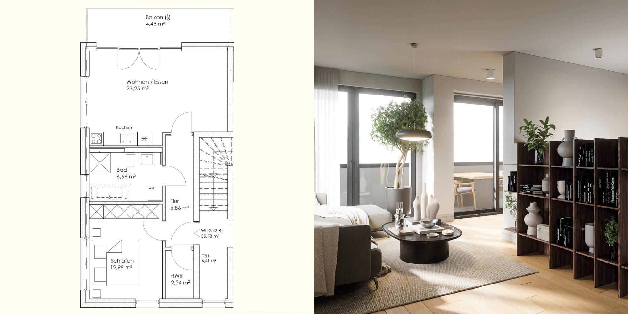 Attraktive Etagenwohnungen stehen mit flächeneffizienten Grundrissen und in gefragten Größen zur Auswahl. Besonders in der 2-Zimmer-Wohnung kommt alles zusammen, was modernes Wohnen auszeichnet: viel Platz, viel Licht und viel Komfort. Circa 55 m² Fläche verteilen sich optimal auf einen großen Wohn- und Essbereich mit offener Küche sowie einem weiteren Zimmer. Teilweise mit Dusche und Badewanne wird das große Bad